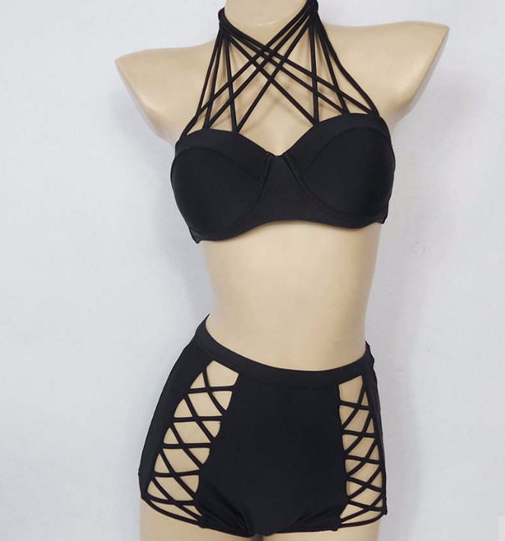 Make a splash with this strappy bikini set push up. Featuring cut out high waisted bandage style bottom, criss cross halter neckline, push up cup and slide back closure. It is made of nylon and spandex materials. It will give additional style to your taste.